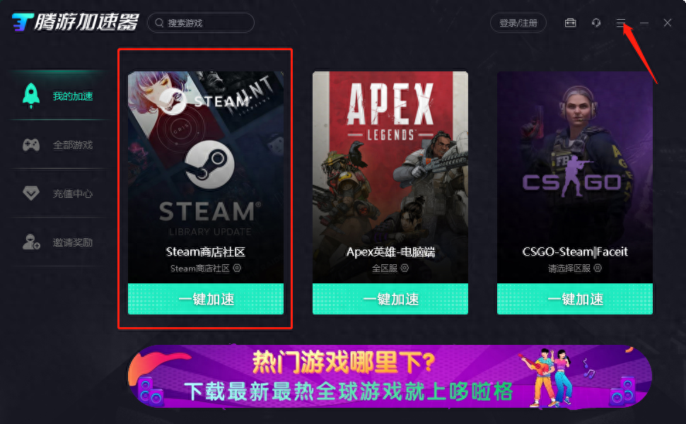 用户的网.环境不佳也会导致Steam无法打开/错误代码118,想要解决这个问题可以尝试使用加速器来为Steam加速,减少网.络波动,稳定网.络环境。推荐使用腾游加速器来为Steam加速。新注册用户登录就送5小时免费时长,输入【TGMYHI】可再额外兑换48小时。