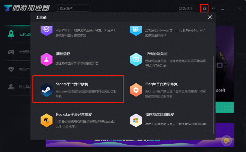 用户也可以尝试使用腾游加速器自带的Steam平台异常修复工具来对Steam进行修复。