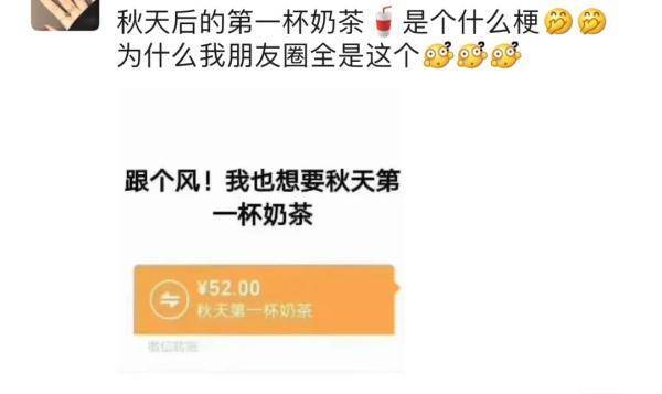 这两天“我想要秋天的第一杯奶茶”,在朋友圈刷屏了。这个梗到底是个啥东西?上网搜了一些,找到了这样的答案: