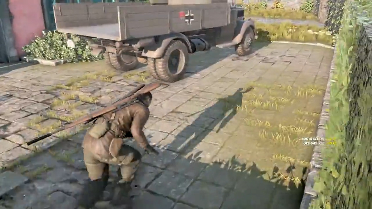 穿过这个路口后,来到一个小的战斗区域,这边会有一个支线任务可以打,先用手枪打掉油桶解决掉卡车,之后利用飞机噪音打远处的主线任务也就是目标军官。