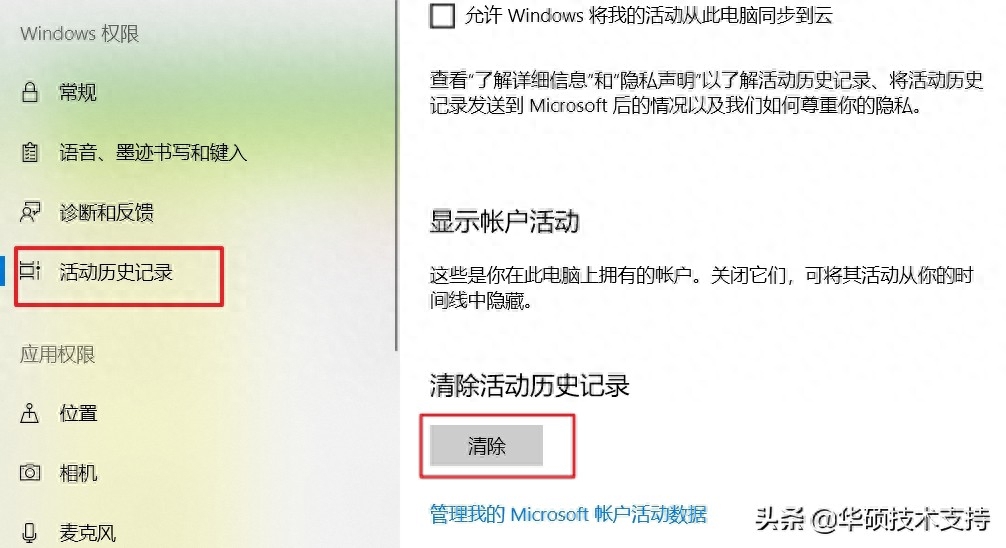 或者点击【活动历史记录】--左侧分别点选“语音”、“搜索”、“浏览”、“媒体”、“位置”等项目,然后点击右边的“清除活动”全部清除,或选择需要清除的某个记录。