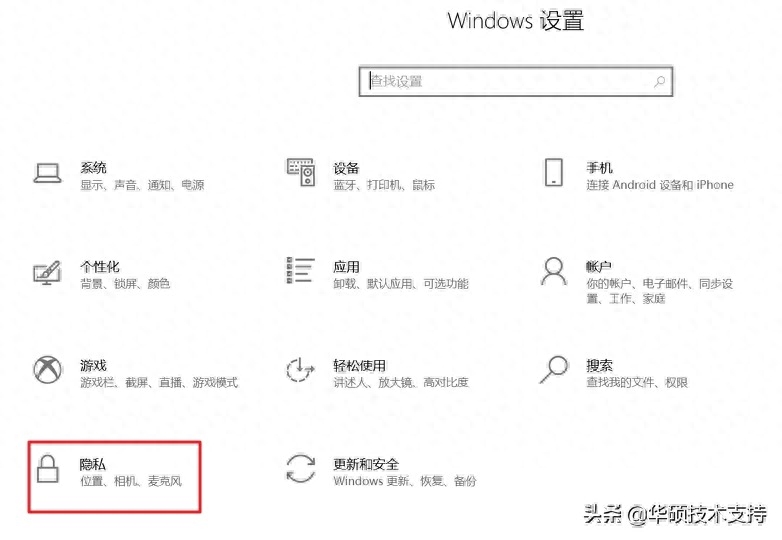 一、首先,由Win10开始菜单点击【设置】图标,进入Windows10设置,点击【隐私】;
