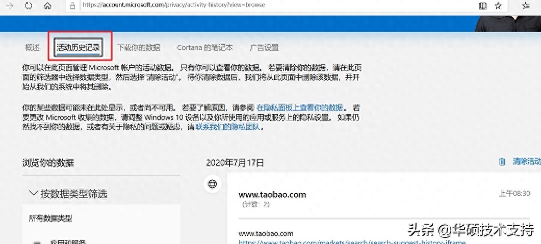 2、Microsoft账户登录之后,“概述”页面可分别查看“浏览历史记录”、“搜索历史记录”等,例如点击“查看清除浏览历史记录’可查看记录并“清除”。